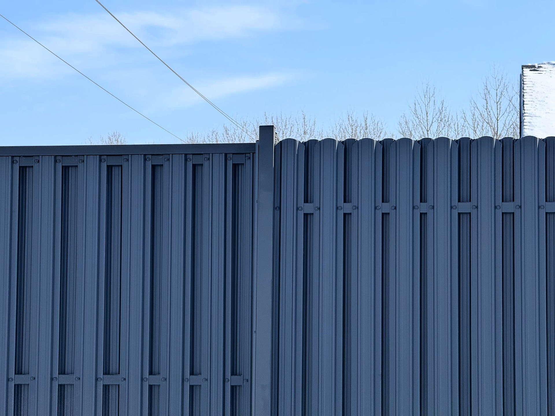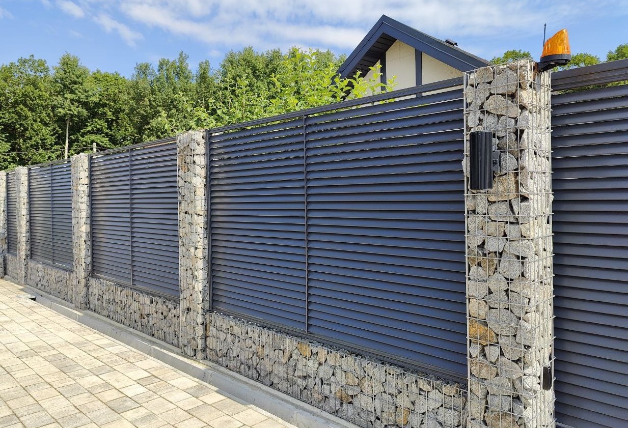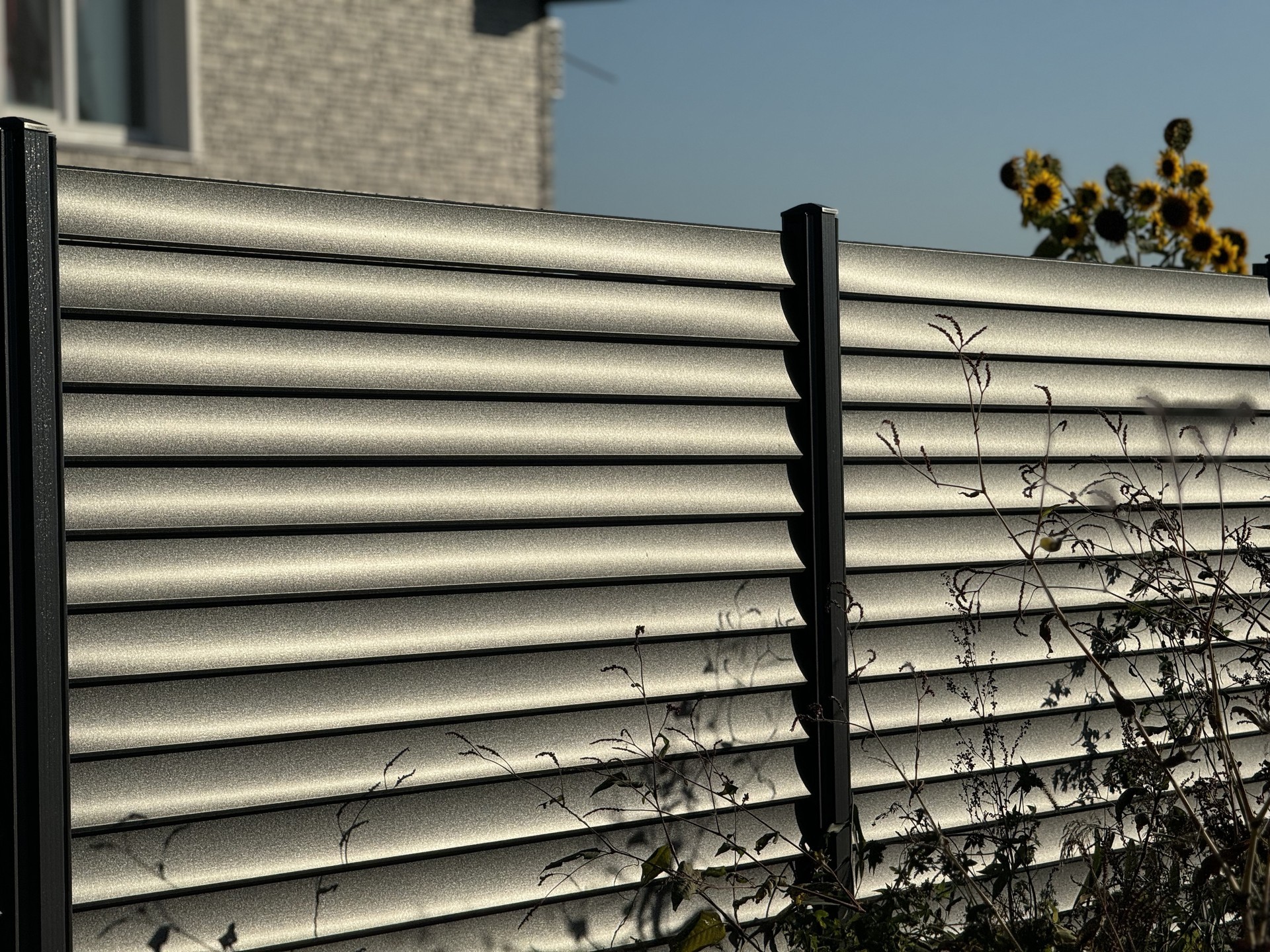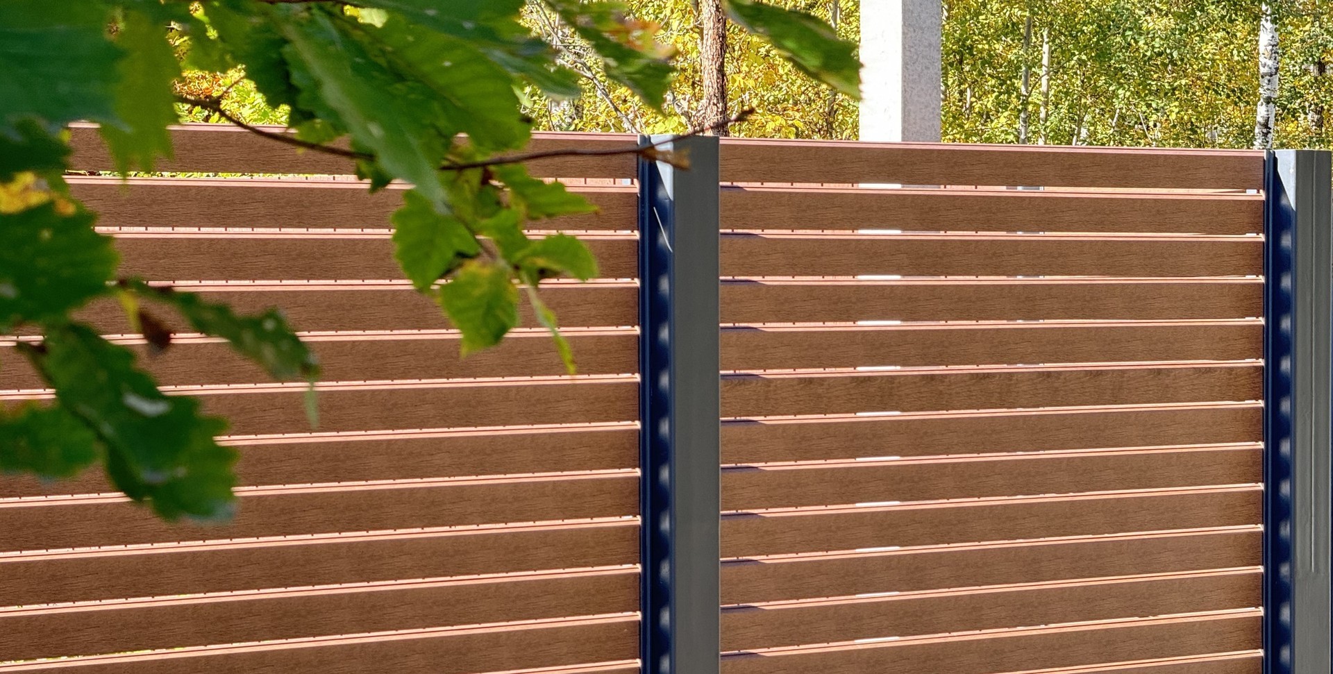 Секционное ограждение со специальными металлическими ламелями. Их расположение создаёт визуальную лёгкость конструкции, способствует попаданию солнечных лучей на участок, хорошо проветривает территорию, поглощает шум, при этом забор остаётся комфортной, красивой и надёжной защитой жилища. Сборка не требует квалифицированных сборщиков, можно собрать самостоятельно по инструкции (вдвоем).