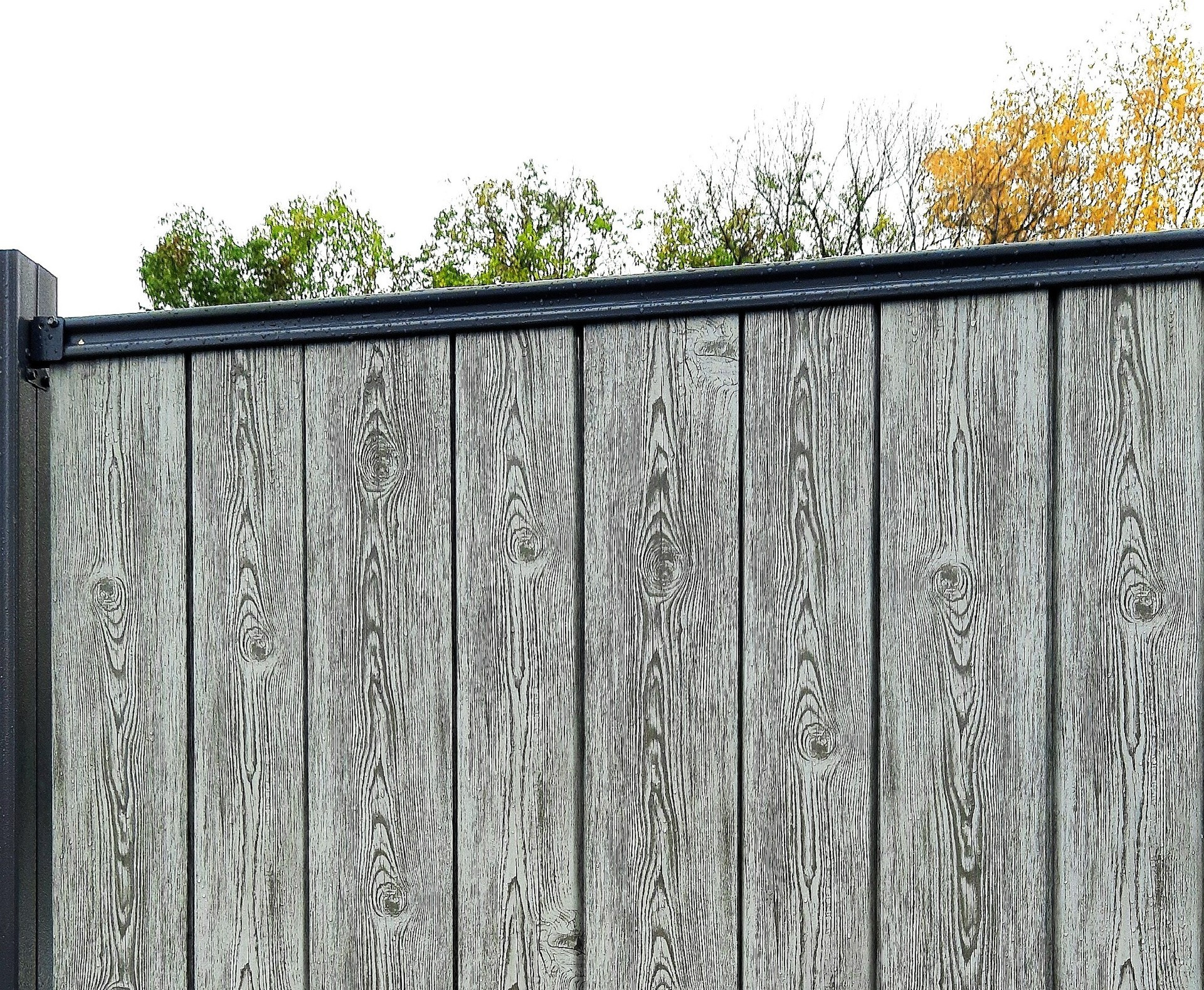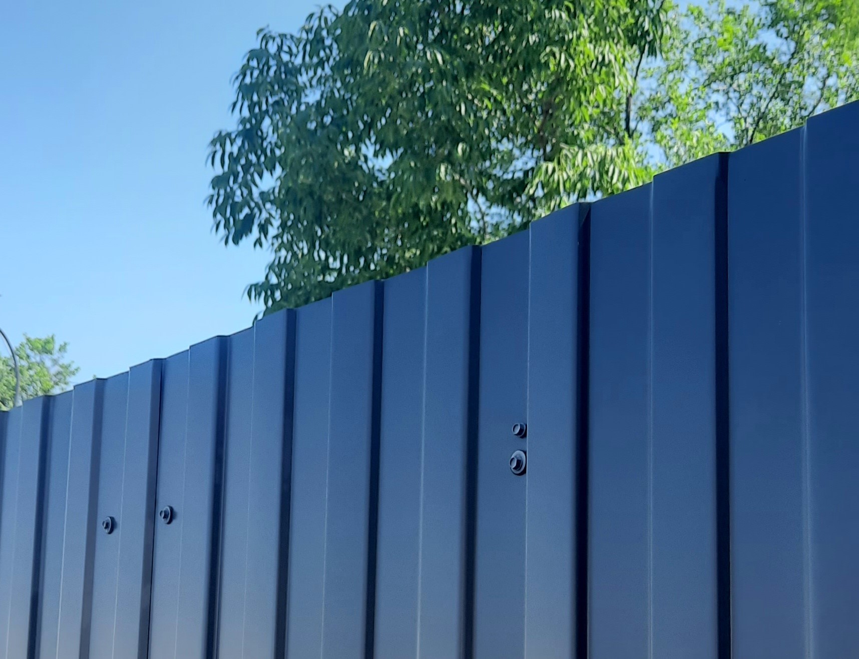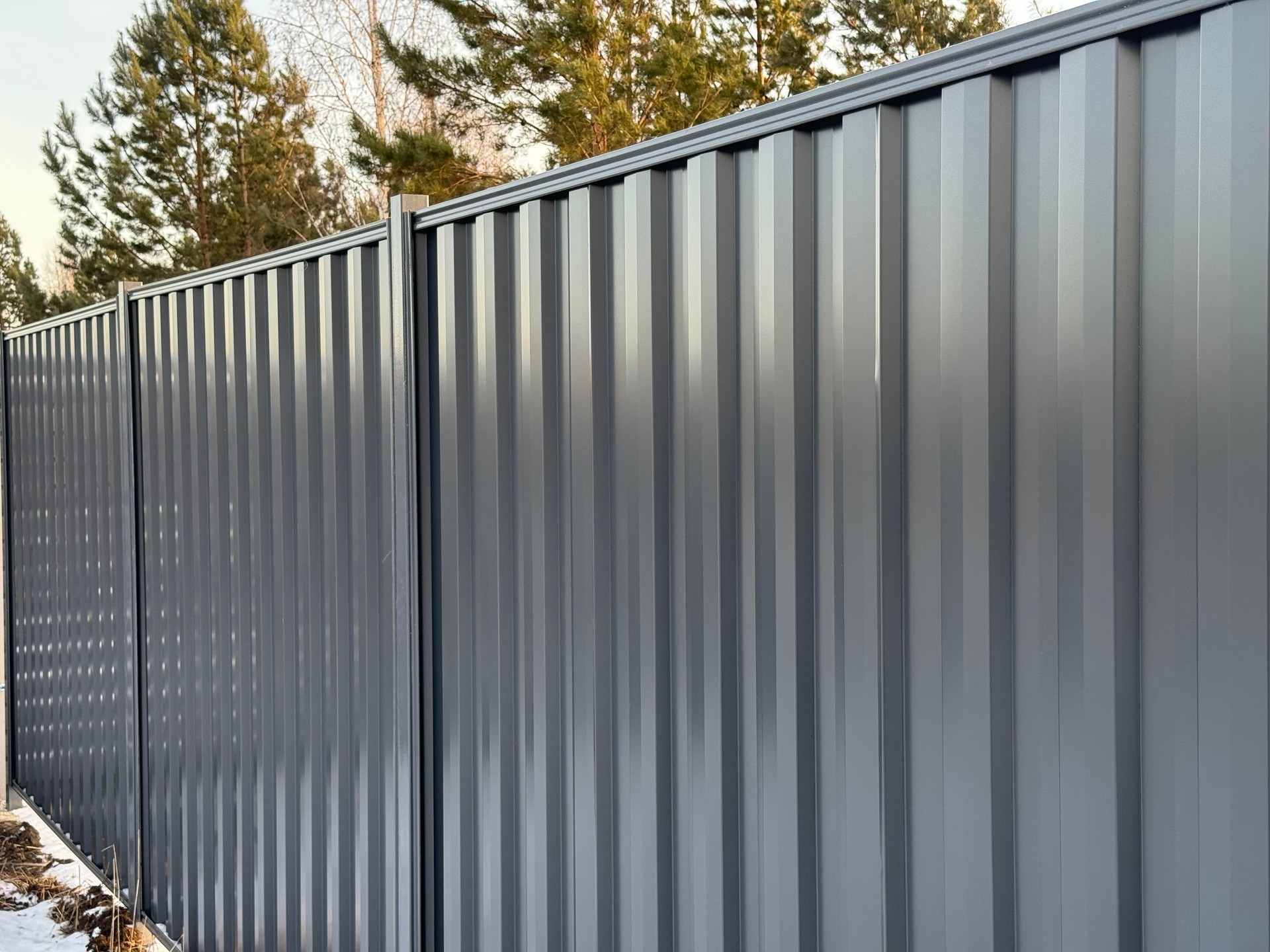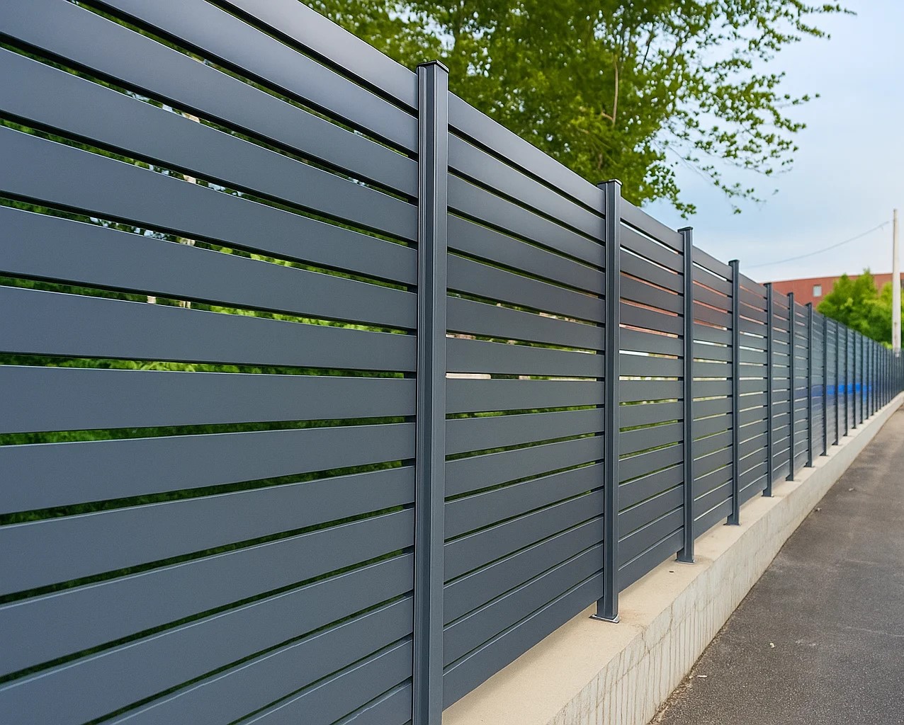 Секционное ограждение со специальными металлическими ламелями. Их расположение создаёт визуальную лёгкость конструкции, способствует попаданию солнечных лучей на участок, хорошо проветривает территорию, поглощает шум, при этом забор остаётся комфортной, красивой и надёжной защитой жилища. Сборка не требует квалифицированных сборщиков, можно собрать самостоятельно по инструкции (вдвоем).